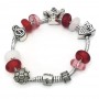 Pulsera de cuentas con los emblemas del Sevilla F.C. y cuentas de colores rojo, rosas y blanco transparentes.